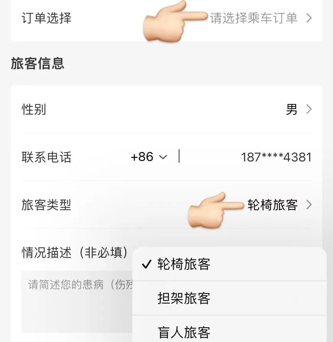 进入“重点旅客预约”页面后点击“订单选择”,选择出行乘车的订单,再点击选择“旅客类型”。