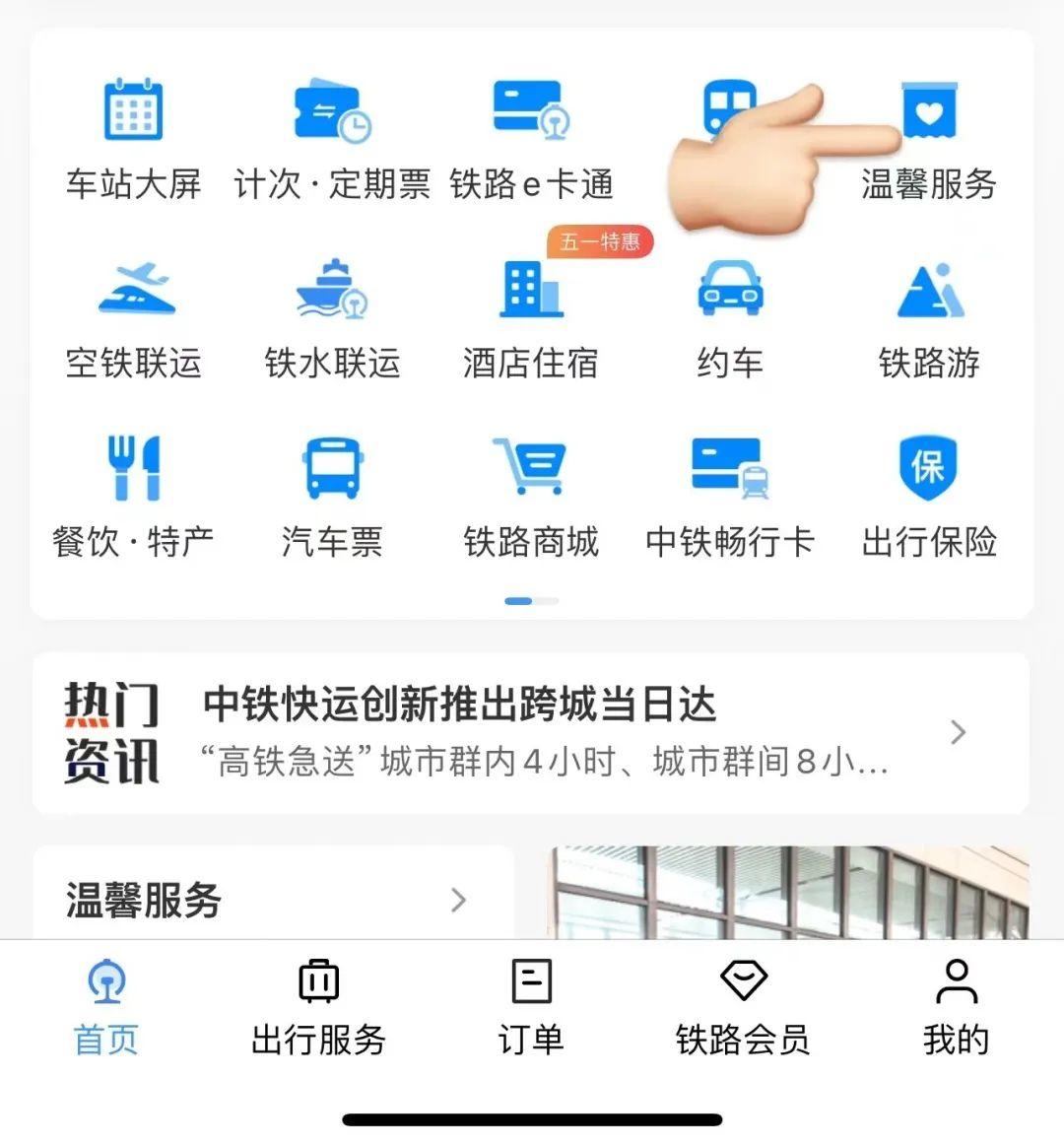 打开铁路“12306”APP进入到主界面,在主页功能页面点击温馨服务。