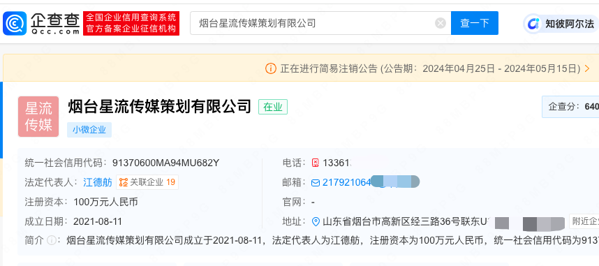 据企查查APP显示,该公司成立于2021年8月,法定代表人为江德舫,注册资本100万人民币,由沈文君(参哥)、江德舫分别持股70%、30%。据2021年至2023年报显示,该公司参保人数均为0。值得一提的是,近日,该公司新增简易注销公告,公告期自4月25日至5月15日。