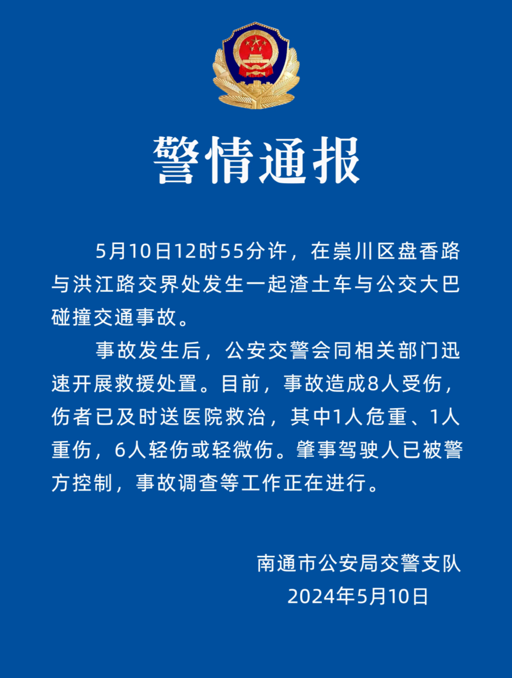 10日下午3时50分,“南通交警”微信公众号发布警情通报。