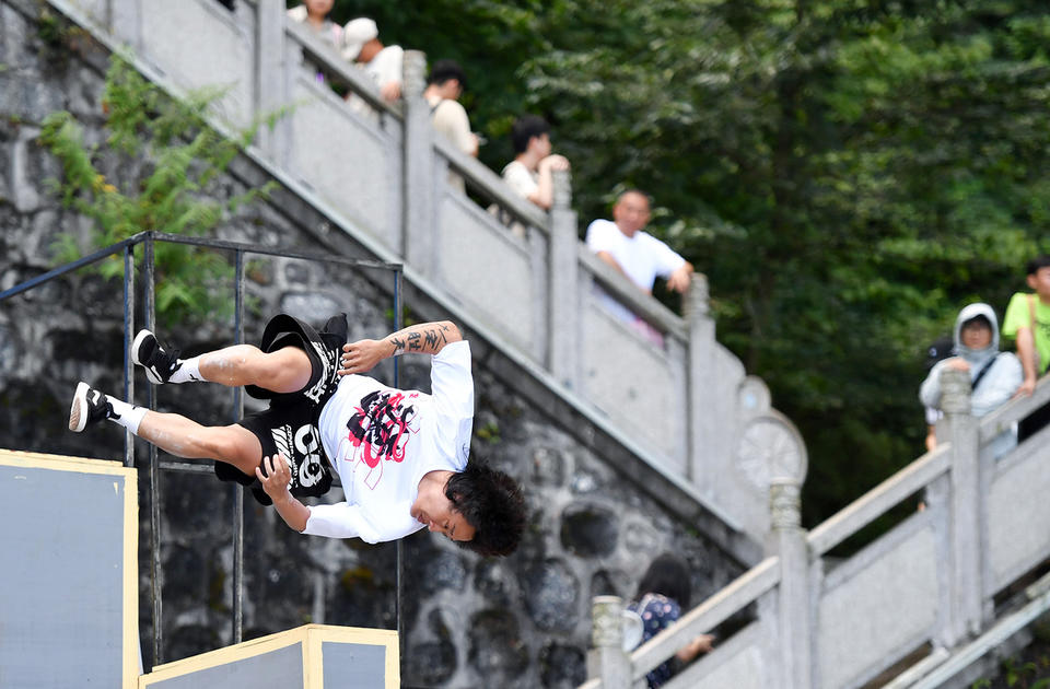 2023年7月23日,第二届天门山云纵天梯跑酷大赛成人技巧决赛在湖南省张家界市天门山风景区举行。新华社