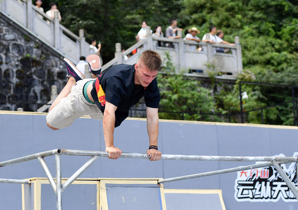 2023年7月23日,第二届天门山云纵天梯跑酷大赛成人技巧决赛在湖南省张家界市天门山风景区举行,波兰选手科瓦莱夫斯基在比赛中。新华社