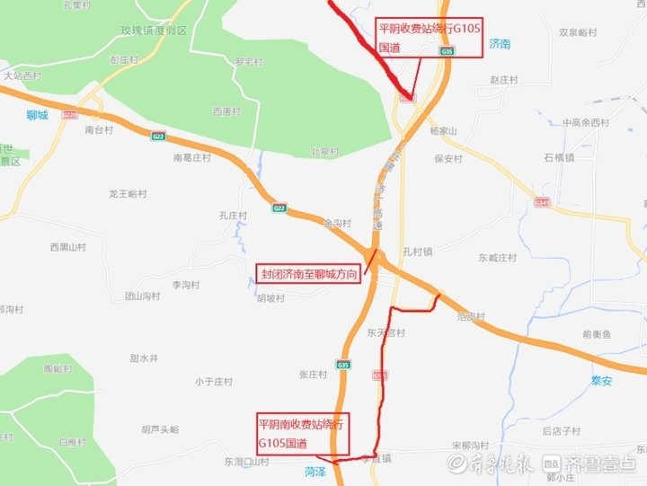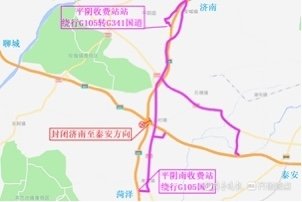 济南经孔村枢纽至聊城方向车辆,可在平阴收费站下高速绕行G105国道;若错过平阴收费站,可由平阴南收费站下高速,绕行G105国道。