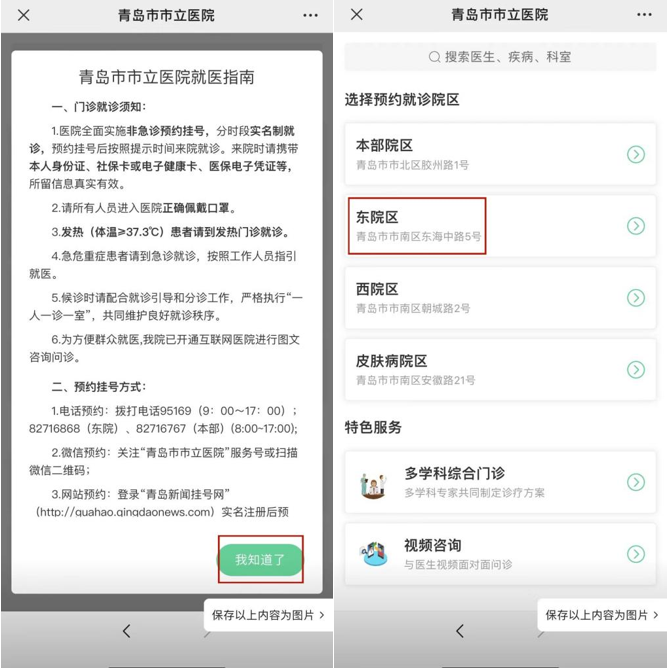 1.关注“青岛市市立医院”微信公众号、服务号,点击菜单栏“诊疗服务”第一项“诊疗服务”,选择“挂号/预约”,预约就诊院区选择“东院区”。