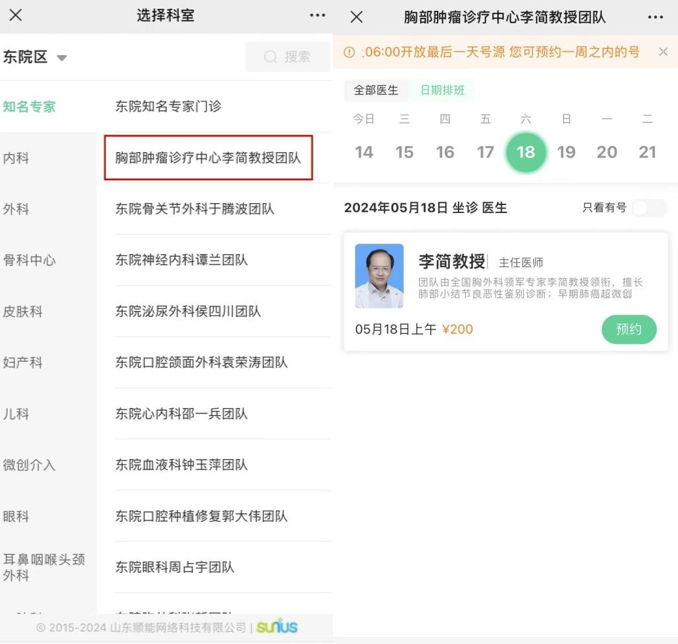 3.选择就诊时间:专家坐诊时间为每周六上午,提前7天开放号源,每天早上6:00开放最后一天号源。