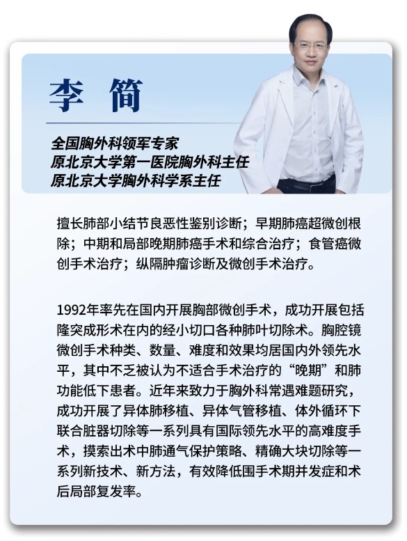 从业三十余年来,李简教授攻破了许多世界性难题,拯救了许多被其他医疗机构判了“死刑”的晚期患者。其独创的“微单孔VATS手术”,仅需要通过腋下2cm的切口即可在完成肺癌根治手术的同时保留更多肺组织,减少肺功能损失,且极大加快了术后康复速度,广受患者欢迎。