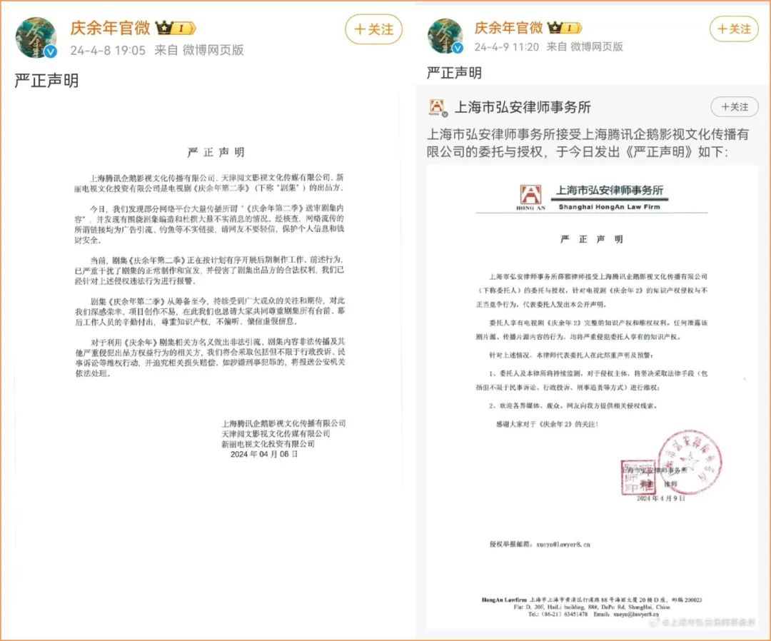 4月8日、9日,庆余年官方微博连续发声回应称,发现部分网络平台大量传播所谓“《庆余年》第二季送审剧集内容”,并发现有围绕剧集编造和杜撰大量不实消息的情况。经核查,网络流传的所谓链接均为广告引流、钓鱼等不实链接。