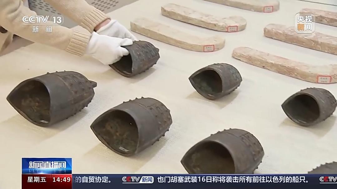 武王墩考古发掘项目考古一组组长 张闻捷:通过我们对它的测音发现,其实可能还有遗失,在数量上可能都主要是以14件为组。这个数量为什么重要,因为像长台关楚墓,它是楚国的封君级,正好出土了13件的青铜钮钟,和这个14件的青铜钮钟之间有非常好的衔接关系。