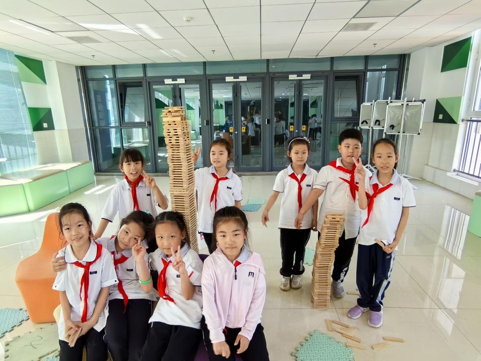 “如果不用一滴胶水和一颗连接零件,仅靠积木之间的堆叠,你认为最多能堆起一座多高的建筑?”带着这个问题,学生们开始组队搭建积木,看着团队合作搭建起来的积木比团队所有成员都高,学生们便搬来板凳,踩着板凳继续搭建,两米多高的“建筑”搭建起来,一个个小小建筑师兴奋不已。