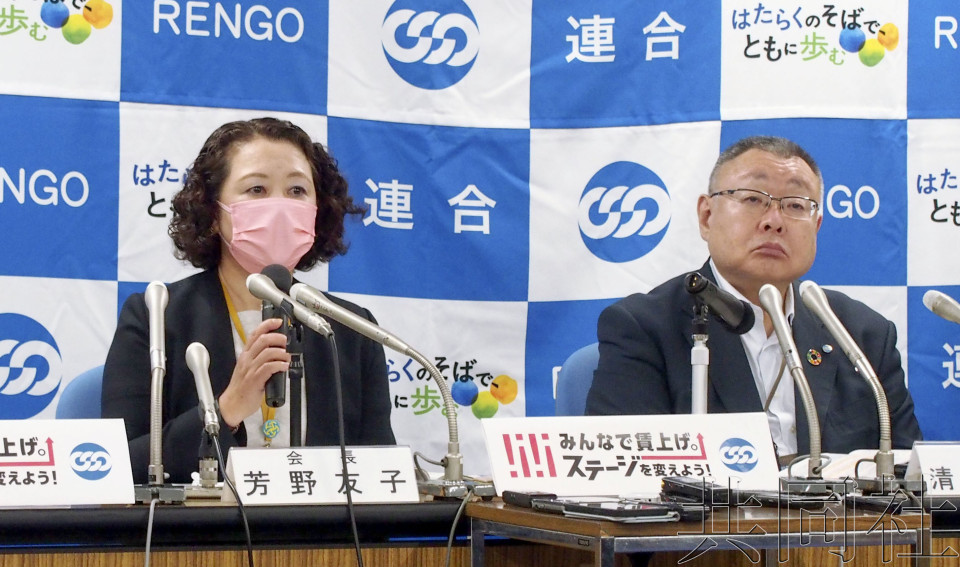 16日,日本工会总联合会会长芳野友子(左)召开记者会。