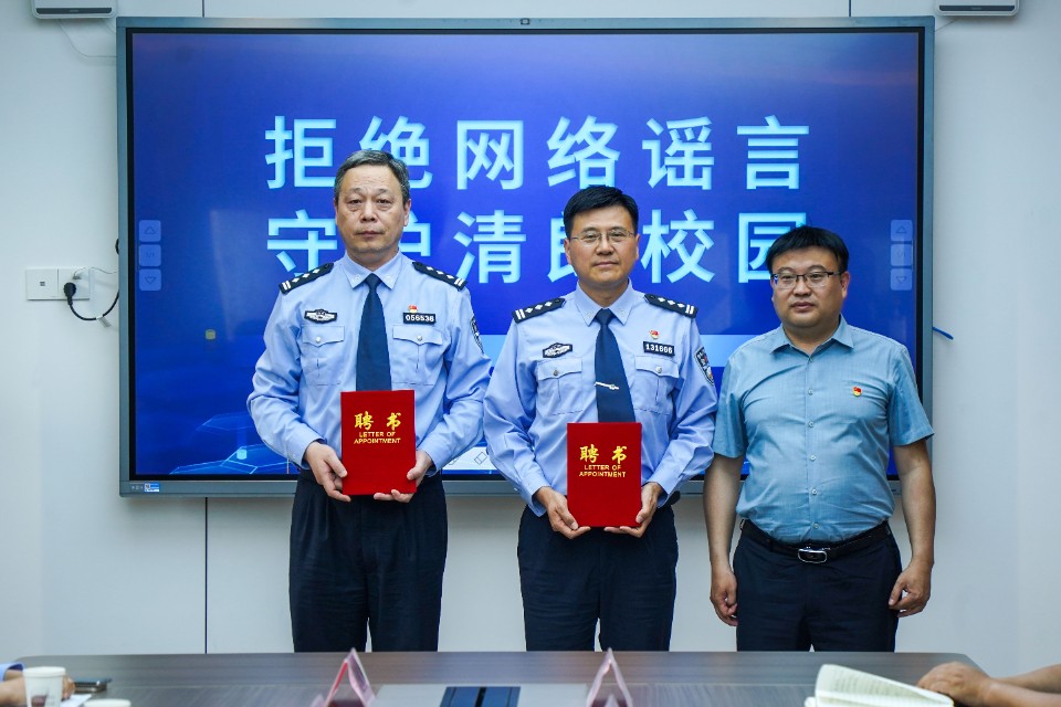 济宁学院附属中学党委书记、校长安波为济宁市公安局网络警察支队支队长郭利锋、济宁市公安局市中区分局党委委员、副局长张岳颁发了《法制辅导员》聘书。警校双方建立了长效合作交流机制,健全了校园网络安全教育体系,为共创清朗和谐校园网络环境,守护青少年健康成长奠定了良好的基础。