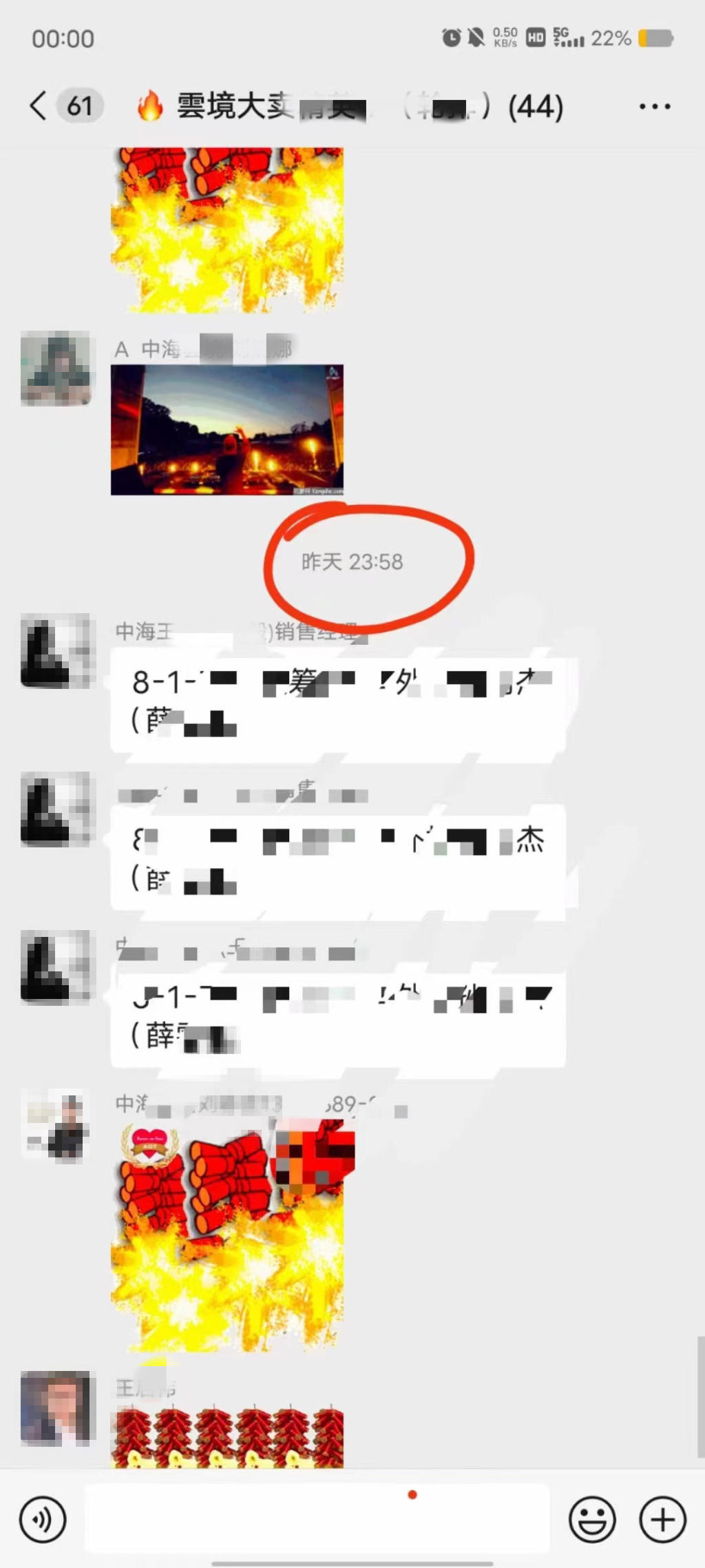 当晚,冯女士向记者发来了该楼盘销售人员的微信群截图。截图显示,周日一天群里认购的喜报不断,直到晚上11点58分还在发喜报。冯女士说,该项目当天累计成交了11套房子。