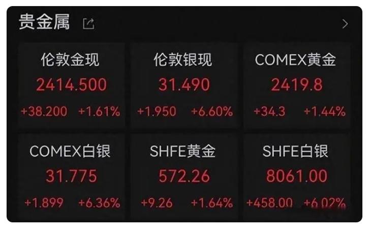 近日,国际黄金、白银价格再次出现大幅上涨。数据显示,截至5月17日收盘,纽约商品交易所COMEX黄金主力合约报2419.8美元/盎司,当日上涨1.44%,逼近4月中旬创下的历史高点2448.8美元/盎司;COMEX白银主力合约当日上涨6.36%,报31.775美元/盎司,创下2013年2月份以来新高。