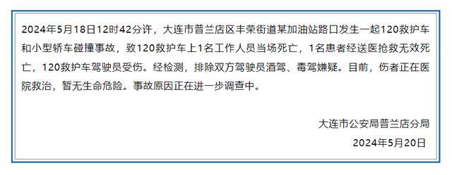 5月18日12时42分许,大连市普兰店区丰荣街道某加油站路口发生一起120救护车和小型轿车碰撞事故,致120救护车上1名工作人员当场死亡,1名患者经送医抢救无效死亡,120救护车驾驶员受伤。经检测,排除双方驾驶员酒驾、毒驾嫌疑。目前,伤者正在医院救治,暂无生命危险。事故原因正在进一步调查中。