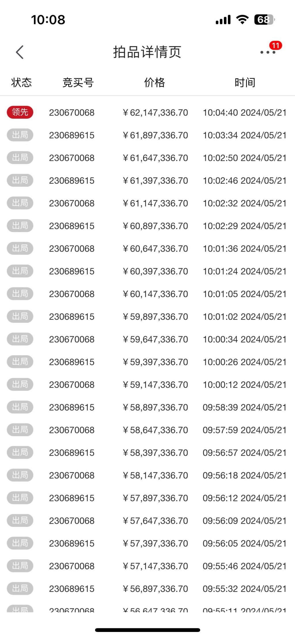 5月20日,该栋别墅开拍后,有两名竞拍者报名,分别交纳了500万元保证金,据竞拍公告显示,竞拍者每次增价幅度为25万元。但记者注意到,该套别墅开拍后,两位竞拍者都没有着急出价,直到5月21日上午9时53分01秒,230670068号竞拍人出价,打破了僵局,两分钟后230689615号竞拍者提价25万元。在短短的11分钟的时间里,两位竞拍者交替出价,进行了25轮竞拍,最终230670068号竞拍者以62147336.7元的价格拿下了该处房产,高于起拍价600万元。
