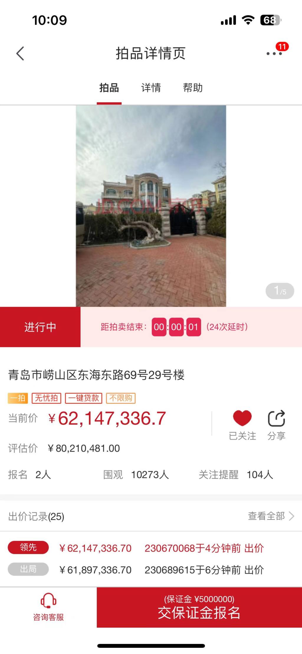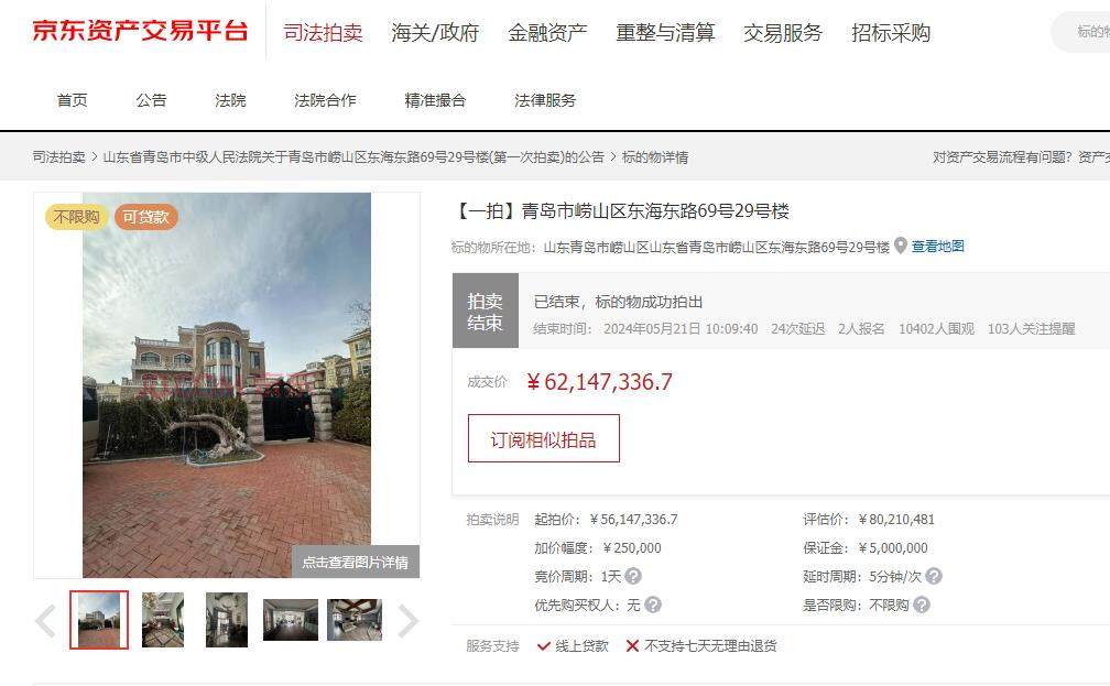 5月20日,在京东法拍平台上,一套位于青岛崂山区东方之珠花园别墅小区的别墅被法拍,这套面积为787.85平米的别墅的评估价为80210481元,起拍价56147336.7元。21日,经过两名竞拍者25轮竞拍,这套别墅最终以62147336.7元的价格成交,溢价600万元。记者了解到,这是今年青岛司法拍卖首次成功拍出的位于前海一线的独栋别墅,也是近几年青岛成功拍出的第二套价格超6000万元的别墅。记者从京东司法平台获悉,今年青岛两级法院今年上拍897套住宅,成交额5.3亿元。
