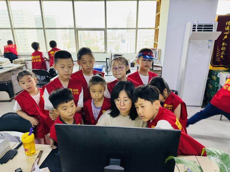 最后,小记者们来到了编辑制作中心,工作人员告诉小记者们:“在这里可以整合各路新闻资源,实现‘一次采集,多种生产,多元传播’。除了大家熟知的报纸,我们还有视频、网络直播、海报、H5等通过网络传播的融媒产品,通过9大平台、70余个端口推送。”小记者们听到这个数字都不禁发出了惊叹声。