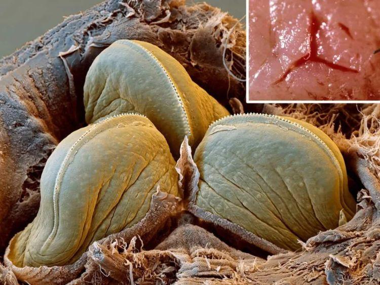 它的每个颚就像一把锯齿状的刀,上面是许多排成一排的小牙齿,它们前后移动,切开宿主的皮肤,通过吞咽产生负压进行吸血。