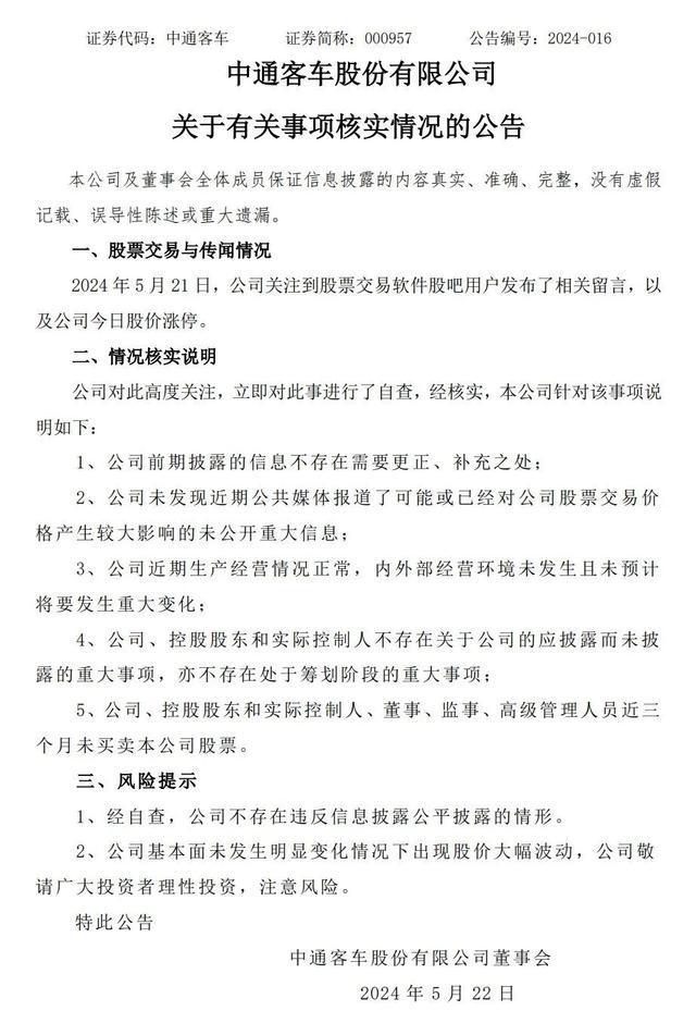 同在5月21日晚间,中通客车公告称,公司关注到股票交易软件股吧用户发布了相关留言,以及公司今日股价涨停。经自查,公司不存在违反信息披露公平披露的情形。公司基本面未发生明显变化情况下出现股价大幅波动,敬请广大投资者理性投资,注意风险。
