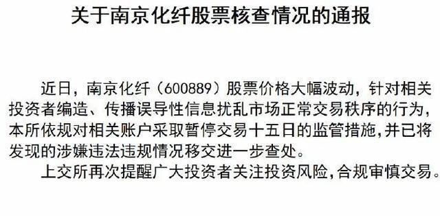 5月21日深夜,上交所发布关于南京化纤股票核查情况的通报称,近日,南京化纤股票价格大幅波动,针对相关投资者编造、传播误导性信息扰乱市场正常交易秩序的行为,上交所依规对相关账户采取暂停交易十五日的监管措施,并已将发现的涉嫌违法违规情况移交进一步查处。上交所再次提醒广大投资者关注投资风险,合规审慎交易。