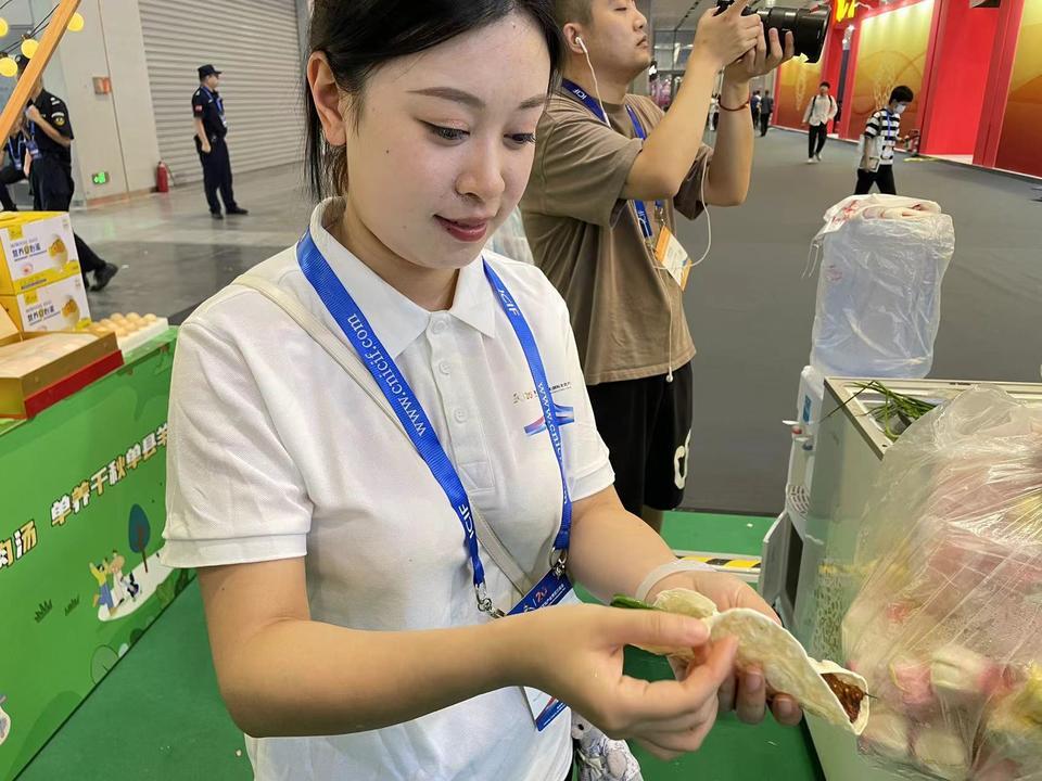 淄博烧烤摊也来到了展会现场。“灵魂三件套”齐聚,小葱、小饼搭配佐料食用,吸引了一大批游客到来。“好吃,停不下来。”一位游客品尝烧烤串后说道。