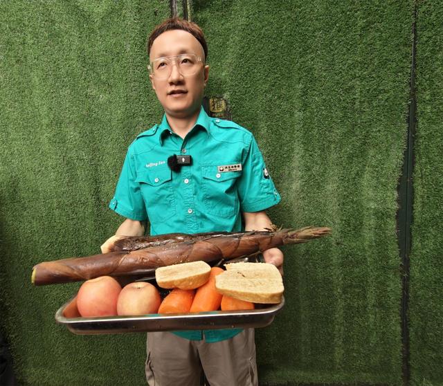 “我现在手里拿着的就是大熊猫日常吃的竹笋,这个是斑竹,这是个水竹,还有饲养员专门为它们制作的窝头。”徐海泓展示着一大盘新鲜美味的食材。“我们大熊猫馆一共饲养着11只大熊猫,9只对外展示,大熊猫‘古古’‘丫丫’因年龄较大目前在后台静养。为了能够照顾好国宝们,我们配备了经验丰富的饲养团队、专业的营养团队、丰容团队以及医疗护理团队,从不同专业角度为大熊猫提供全方位的生活福利保障。”