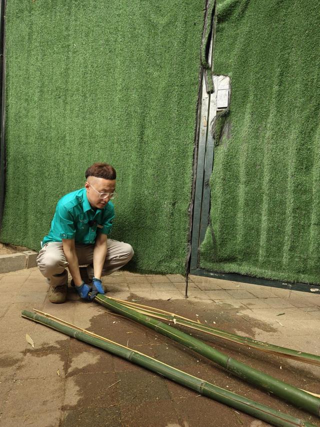 此时,在大熊猫馆的后院,饲养员正在为大熊猫准备食物。他们用力将一根根竹子摔在地上,摔了几次之后,竹子被摔成了条状,“这样大熊猫吃起来就方便了,减少牙齿的磨损。”饲养队大熊猫馆班长徐海泓说,一名饲养员每天要摔70-80公斤竹子。