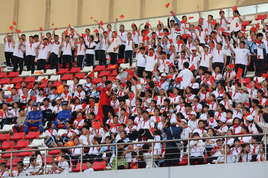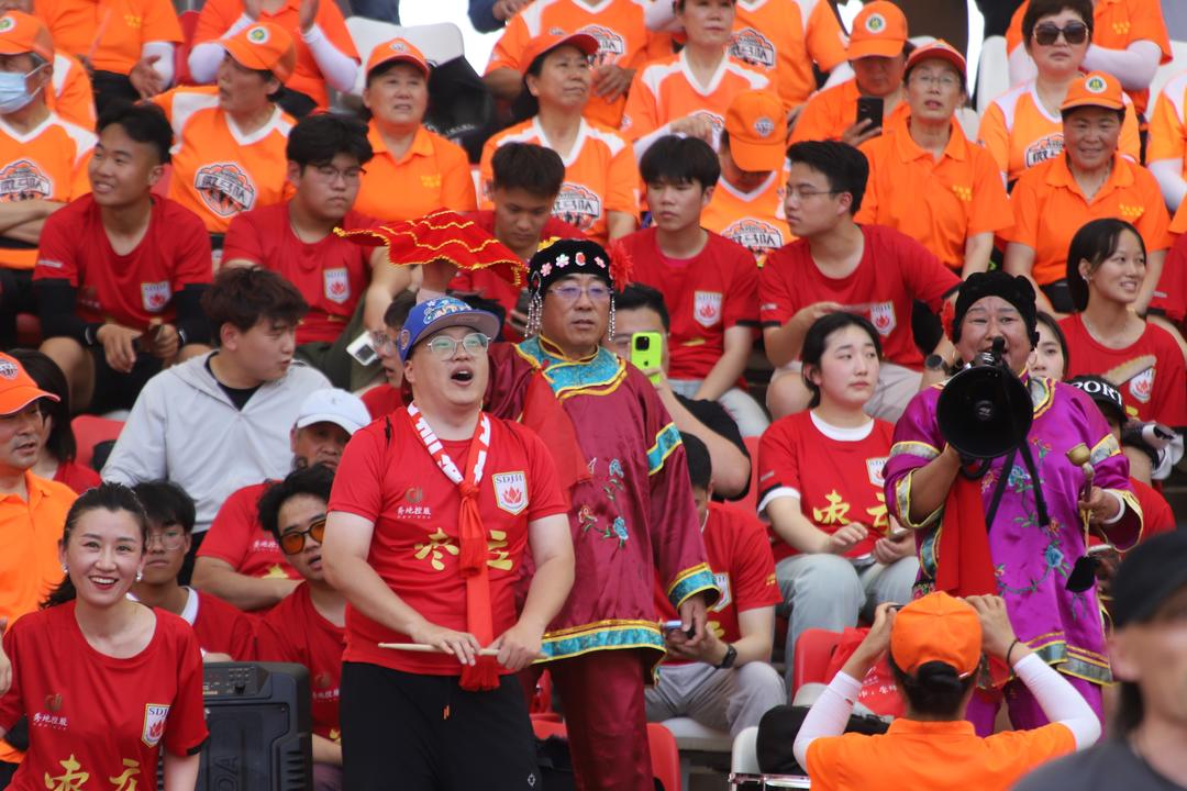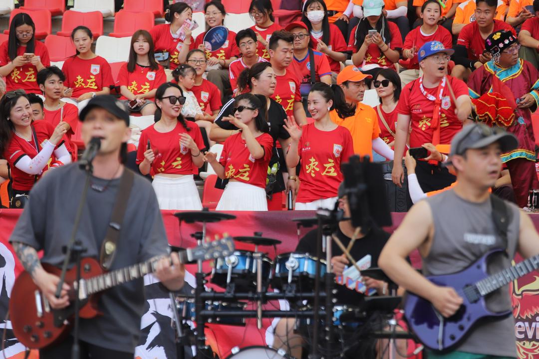 随着在南看台舞台上现场助演的旁观者乐队《弹起我心爱的土琵琶》的歌声响起,现场万名观众一同合唱这首枣庄人耳熟能详的经典红歌,赛场氛围被推向高潮。
