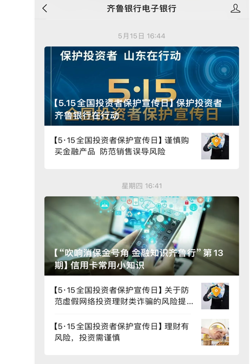发挥总行线上渠道优势,创新暖心智能语音提示。齐鲁银行充分发挥总行渠道线上宣传优势,在微信公众号、手机银行、网银、语音导航等多种宣传渠道,发布宣传海报、风险提示、理财小知识等,凝聚宣传合力,打通信息传播壁垒。通过“客服热线智能语音导航”渠道,发布5•15全国投资者保护宣传日暖心语音提醒:“请勿相信‘内部信息’、‘优先交易’、‘稳赚不赔’等宣传噱头,通过正规渠道投资,谨防财产损失”。在齐鲁银行公众号刊连续发布“5·15 保护投资者,齐鲁银行在行动”宣教海报、关于防范虚假网络投资理财类诈骗的风险提示、谨慎购买金融产品防范销售误导风险等提示,引导消费者规避投资陷阱。在手机银行、网银滚动播放“树立理性投资理念,增强风险防范意识”的5·15 投资知识长图,丰富消费者金融知识储备。