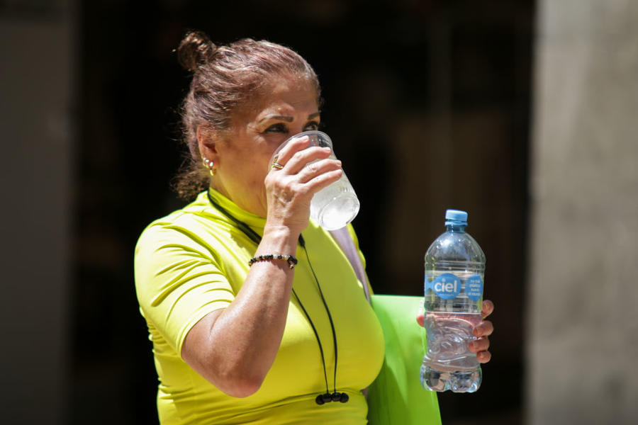 4月16日,在墨西哥首都墨西哥城,行人喝冷饮缓解酷暑。新华社发