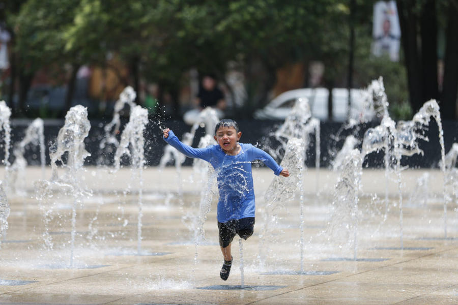 5月15日,在墨西哥首都墨西哥城,儿童戏水消暑。新华社发