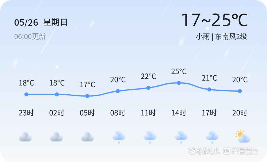 今日青岛小雨绵绵,气温适中,市民出行需注意携带雨具。根据最新天气预报,5月26日青岛市区天气为小雨,气温在17℃至25℃之间,东南风2级,空气质量良好,PM2.5浓度为29微克/立方米,空气质量等级为优。市民出行建议携带雨具,注意防滑,避免因雨天路滑而发生意外。
