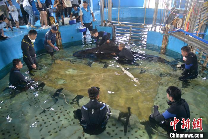 5月25日,在三亚海昌生物保育中心,救助团队合力将短肢领航鲸“海棠”引入转运担架。张月和 摄