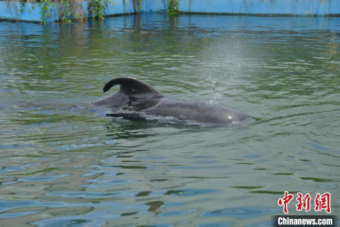 5月25日,短肢领航鲸“海棠”在三亚海昌生物保育中心户外水池中畅游。张月和 摄