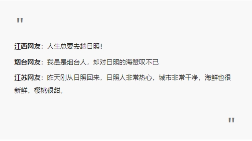 来自北京的网友:“因为一部电影认识日照,因为日照的慢节奏生活、美食美物而喜欢上日照,每年都会来一次日照,日照他最喜欢的地方就是‘生活感’,日照让他觉得踏实、可亲。”