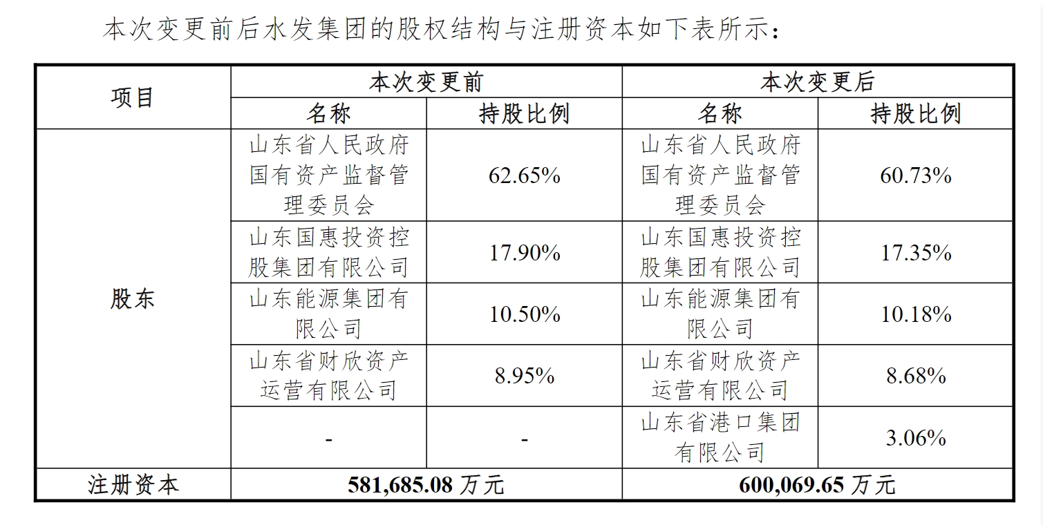此次增资完成后,水发集团注册资本为600069.65万元。其中,山东省国资委出资364404.32万元,持有水发集团60.73%的股权;山东国惠投资控股集团有限公司出资104115.52万元,持有水发集团17.35%的股权;山东能源集团有限公司出资61107.48万元,持有水发集团10.18%的股权;山东省财欣资产运营有限公司出资52057.76万元,持有水发集团8.68%的股权;山东港口集团出资18384.58万元,持有水发集团3.06%的股权。山东省国资委仍为水发集团的实际控制人。