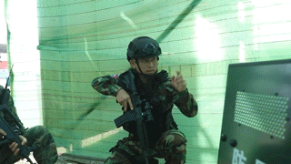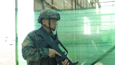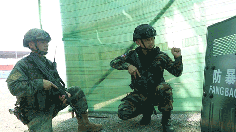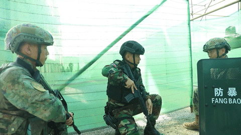 “发现恐怖分子,一组掩护,二组突入!”在模拟厂房外,中方参演队员郑毅左手向下竖起大拇指,随后做出单手举过头顶、连续拍枪等动作,柬方参演队员迅速领会,跟随中方参演队员向建筑物突入。