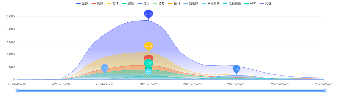 5月19晚事发后,舆情在5月20日经媒体报道后热度迅速提升,最终在5月22日达到顶峰,当日即产生9300余篇相关信息。随后,事件热度逐渐走低。