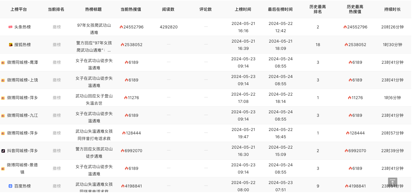 齐鲁蛙眼舆情大数据平台监测显示,自2024年05月19日至2024年05月26日,共监测“女子登武功山失温遇难”事件相关舆情22625条。