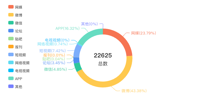 从舆情信息分布情况看,各类媒体报道总数量为22000余条,微博(占比43.38%)是主要传播平台,其次是网媒(占比23.79%)、APP(占比16.31%)、短视频(占比7.42%)、微信(占比4.85%)。