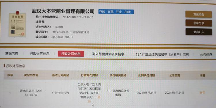 5月24日,武汉市洪山区市场监督管理局发布“洪市监处罚[2024]149号”决定书,认定武汉大本营商业管理有限公司(简称大本营)存在广告违法行为。大本营公司在“泛悦·城市奥特莱斯”招商过程中,存在虚假宣传,责令改正违法行为并在相应范围内消除影响,并给予罚款35000元的行政处罚。