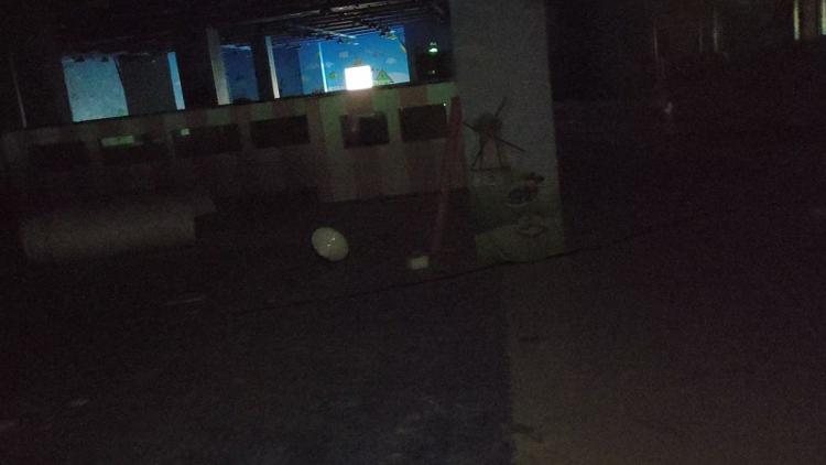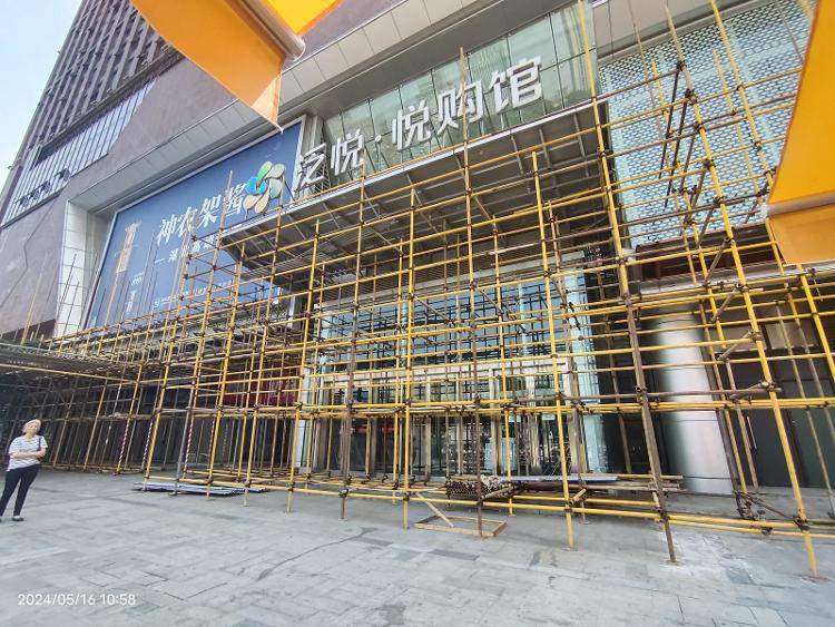 目前悦购馆正门还架起了脚手架准备施工,记者在外侧悬挂的施工许可证上看到,这是针对托卡马克狮子座外立面的改造工作。商场大门紧闭,只能从侧面一入口乘坐直升电梯进入商场。商场内只有五楼亮着灯,五楼有健身房、台球室等在营业,其他楼层一片漆黑、堆放着各种破碎的建材垃圾。商场中庭还悬挂着停业店铺的宣传条幅,上边印刷着“盛大开业”字样。