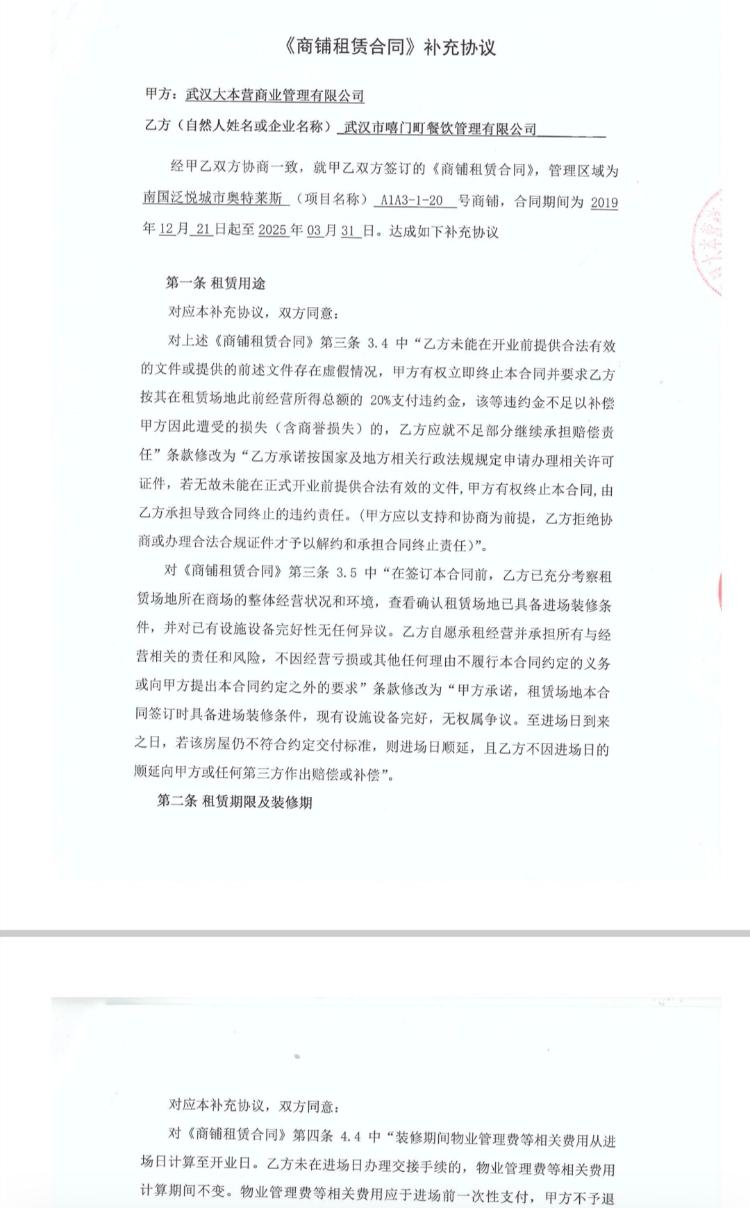 海报新闻记者在补充协议中看到,大本营公司承诺,租赁场地本合同签订时具备进场装修条件,现有设施设备完好,无权属争议。至进场日到来之日,若该房屋仍不符合约定交付标准,则进场日顺延,且嘻门町不因进场日的顺延向甲方或任何第三方作出赔偿或补偿。