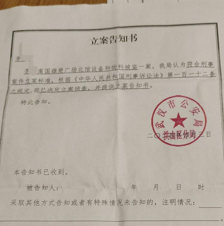对于商铺内物品丢失一事李先生向武汉市公安局洪山区分局报警,洪山分局出具的立案告知书显示,李先生等人报案称设备及物资丢失,符合刑事立案标准,已于2024年4月3日决定立案调查。