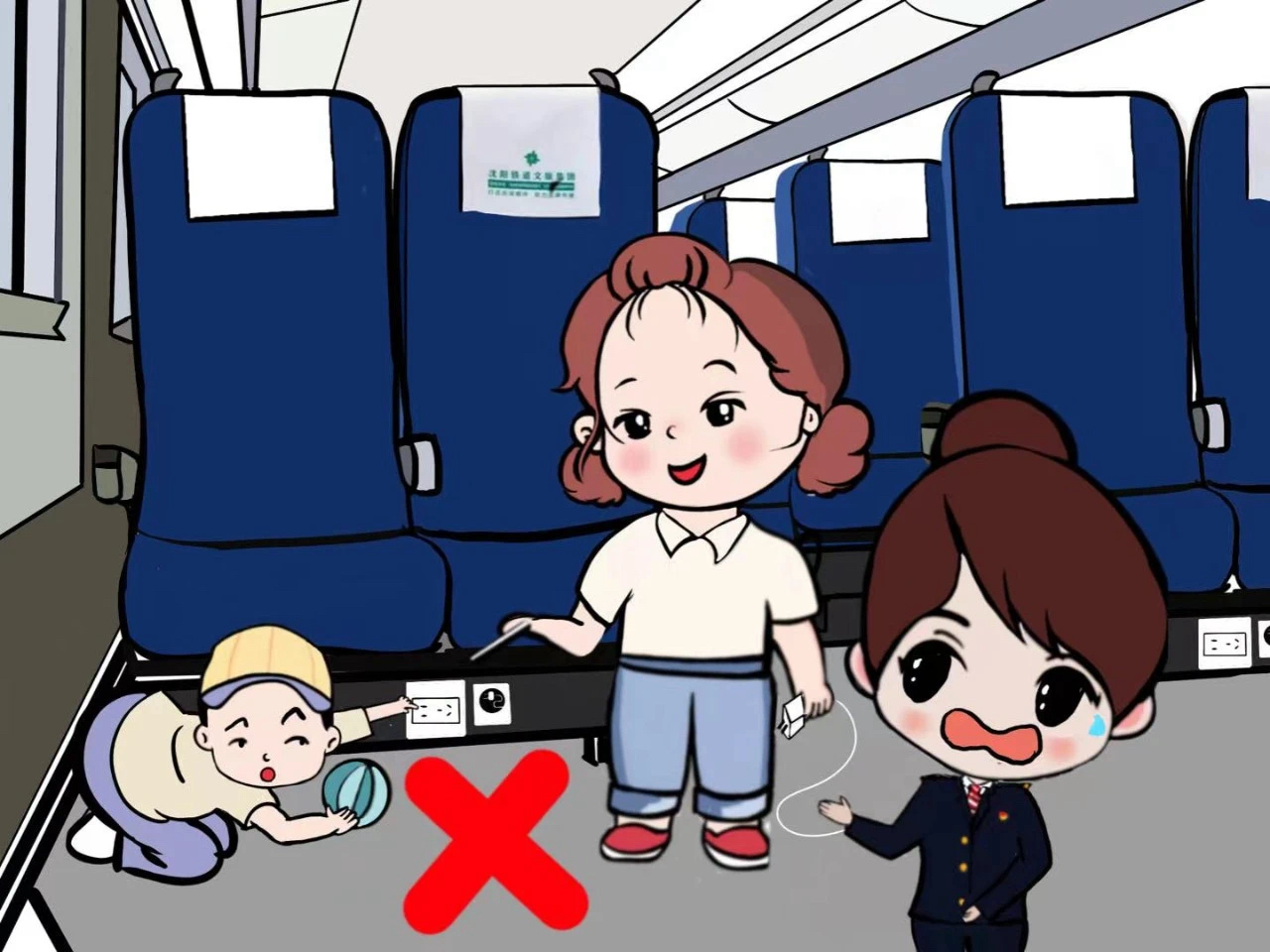 乘坐高铁时,家长要看护好随行儿童,不要用手指触碰电源插座,以免发生危险。