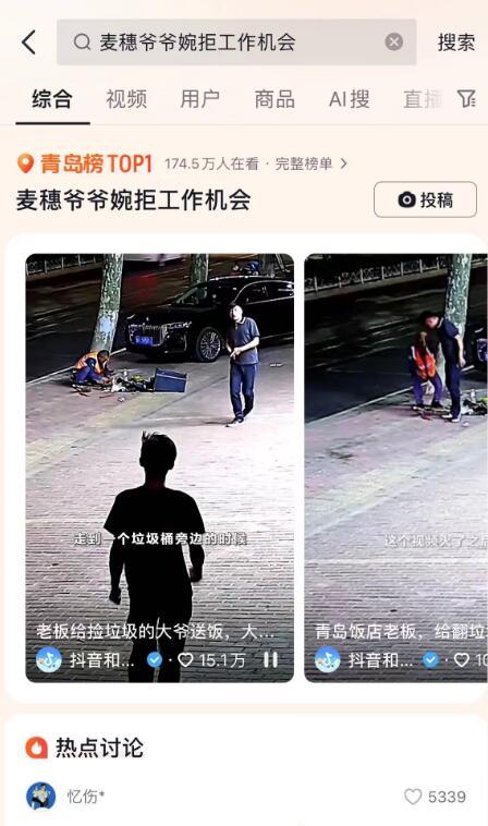 5月29日,“麦穗爷爷婉拒工作机会”的话题冲上抖音热搜,登上青岛榜TOP1。近期,陈婆婆砂锅店老板陈相民和“麦穗大爷”的“双向奔赴”,牵动无数网友的心,央广网、青岛“网红天团”成员等纷纷点赞。陈相民表示,感谢众多网友的支持和关注,将会继续传递爱心。