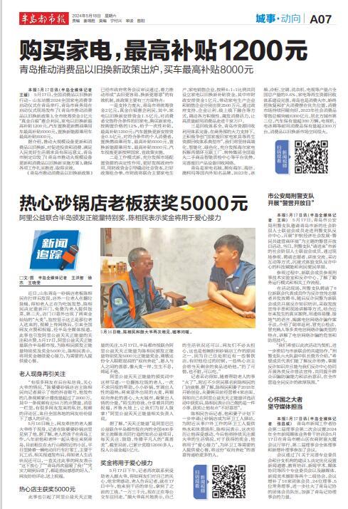 “感谢半岛都市报及阿里公益的奖励。”5月24日,陈相民告诉记者,他已经收到奖励,将用奖金继续爱心接力,“我已经联系了环卫工人这边的领导,打算把我们店铺作为一个驿站,长期给环卫工人做一些力所能及的事。我们已经把老人送的麦穗当作镇店之宝,把店开好,以后能帮还帮!”