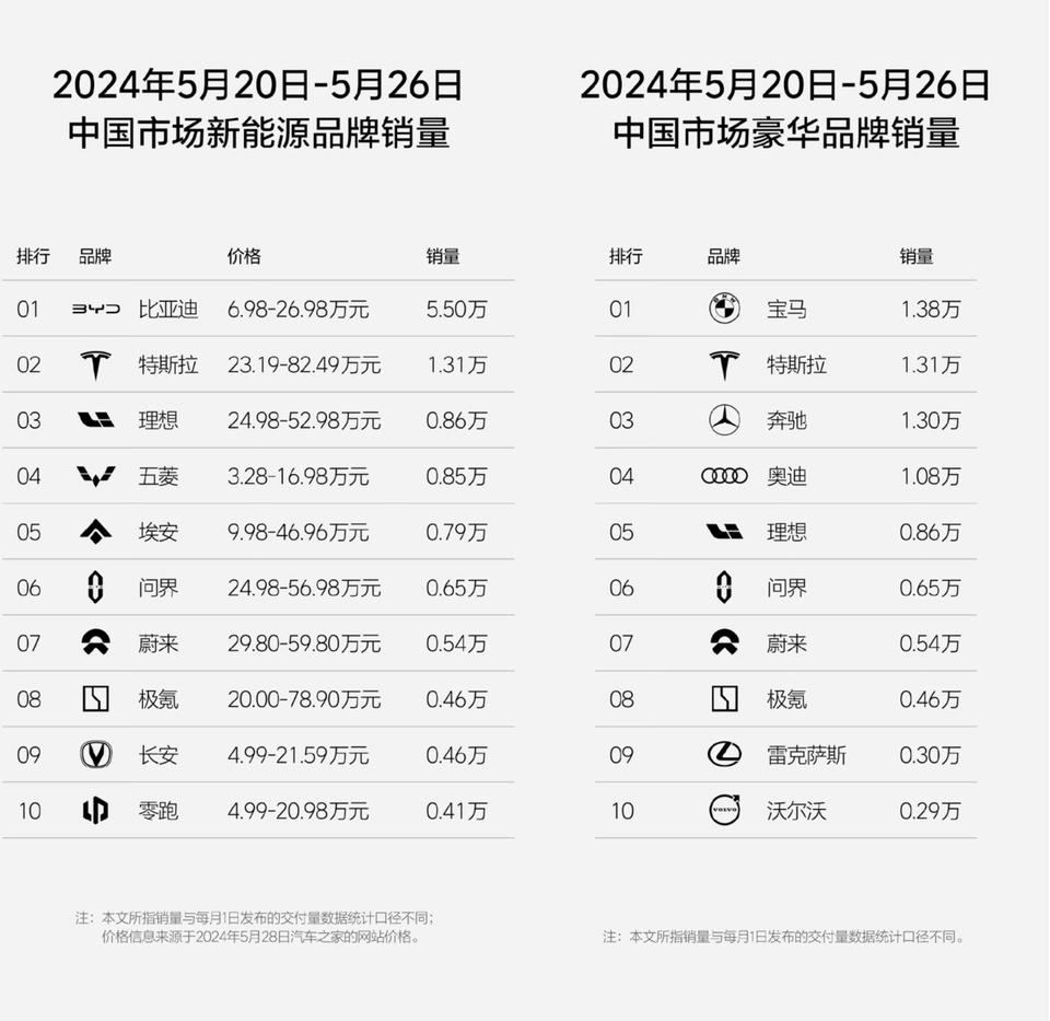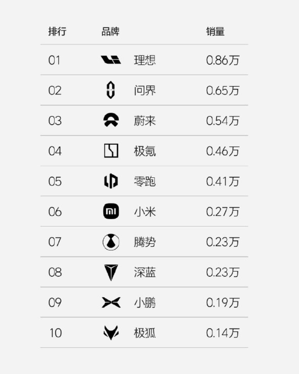 在中国市场新能源品牌销量排行榜中,理想汽车位列第三,稍逊于特斯拉,比亚迪稳居榜首。此外,在中国市场豪华品牌销量排行榜中,理想位列第五,该榜单前四位分别是宝马(1.38万)、特斯拉(1.31万)、奔驰(1.3万)、奥迪(1.08万)。