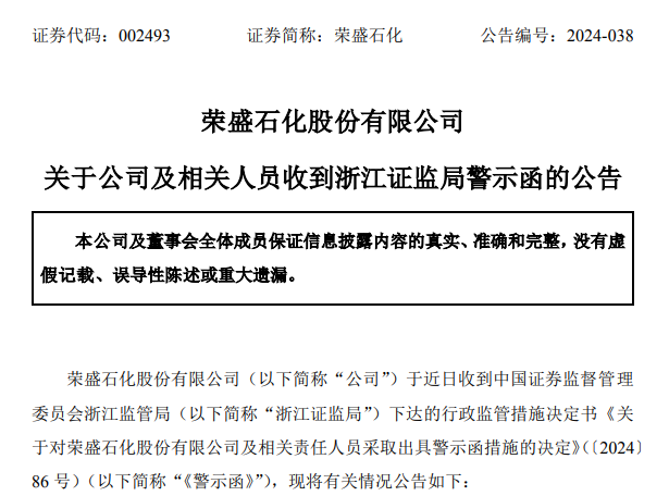 5月30日,荣盛石化(002493.SZ)公告称,因业绩预告相关信息披露不准确,浙江证监局对其及相关责任人员采取出具警示函的措施。