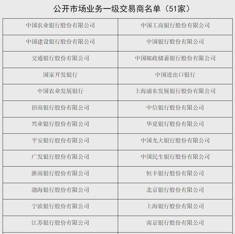 中国人民银行公告显示,根据公开市场业务一级交易商考评调整机制,中国人民银行对2023年度公开市场业务一级交易商及申请加入一级交易商的机构进行了综合评估,根据评估结果,确定了2024年度公开市场业务一级交易商,共51家。